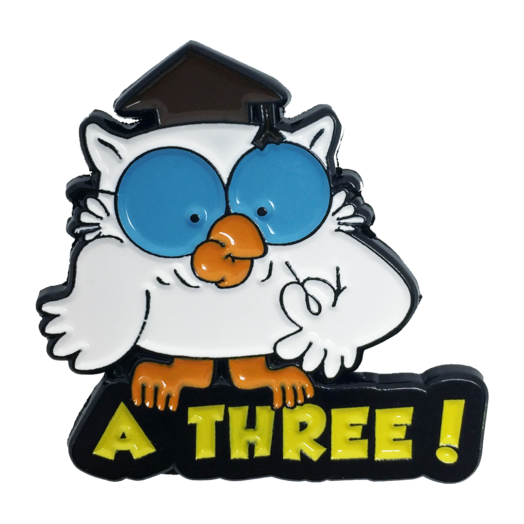 This enamel pin features the lovable Mr. Owl in color letting you know how many licks it takes to get to center of a Tootsie Pop (A Three!). This pin showcases our logo printed on back in raised metal.