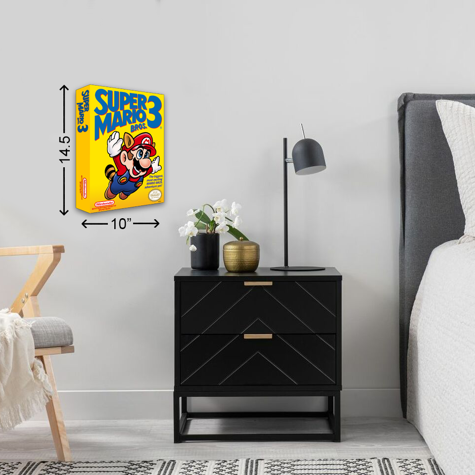 How cool are these jumbo sized NES games, made to look 3D but they are actually flat! Each box art image is painstakingly recreated, custom laser cut on 1/8" MDF board and then dye-sublimated. Every piece is finished with a sawtooth picture hanger making them ready to display and hang immediately. All finished products have a hi-shine / hi-gloss finish.